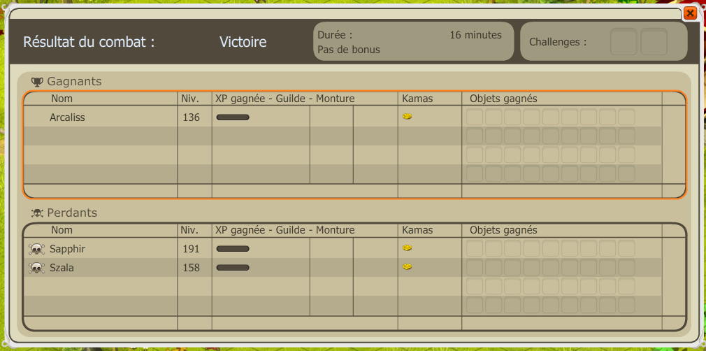 | actuel | 7 mai 2010 à 23:40 | 1 010 × 502 (107 Kio) | Agent-reds (discussion | contributions) | Arcaliss lvl 136 VS Sadi 191 + Panda 158 | |