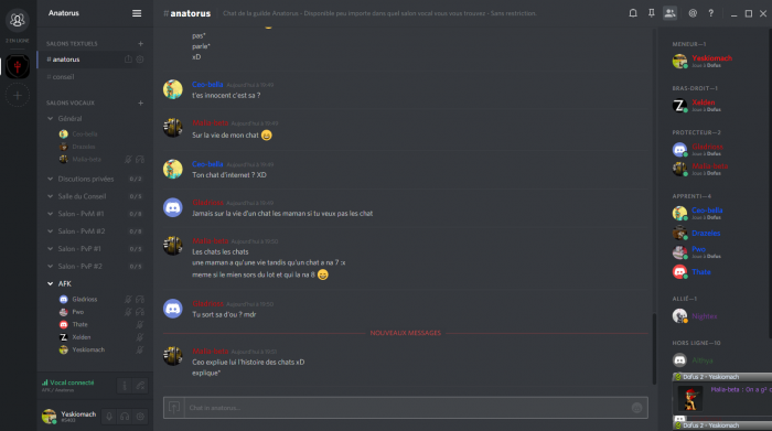 Il a été mis en place, disponible à tous les membres, un serveur vocal (Logiciel : Discord). Il est accessible sur PC en téléchargent le logiciel Discord, et sur mobile, en téléchargeant l'application. Il y a plusieurs salons vocaux, ainsi vous pouvez vous retrouver en petit comité pour jouer, ou encore avec tout le monde, dans la cacophonie générale. Switcher d'un salon vocal à l'autre se fait en une fraction de seconde, ce qui rend l'outil très intéressant. Il est totalement gratuit, et bien plus sécurisé que Skype ou TeamSpeak, c'est pourquoi Ankama le recommande officiellement : http://www.dofus.com/fr/mmorpg/actualites/devblog/billets/562373-prevention-ddos